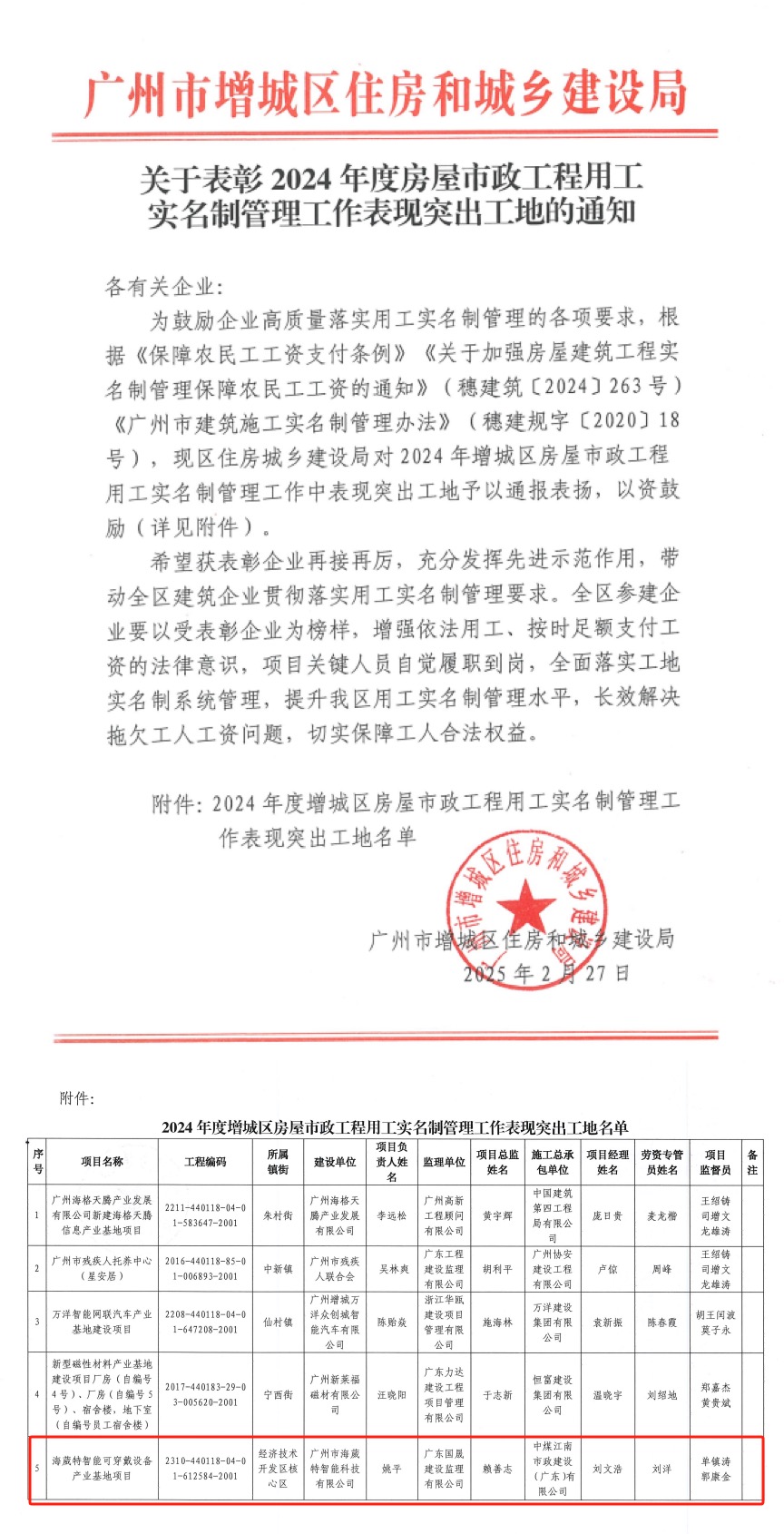 近日,廣州市增城區(qū)住房和城鄉(xiāng)建設(shè)局發(fā)布了《關(guān)于表彰2024年度房屋市政工程用工實(shí)名制管理工作表現(xiàn)突出工地的通知》,中煤江南市政公司承建的海葳特智能可穿戴設(shè)備產(chǎn)業(yè)基地項(xiàng)目榮獲表彰。