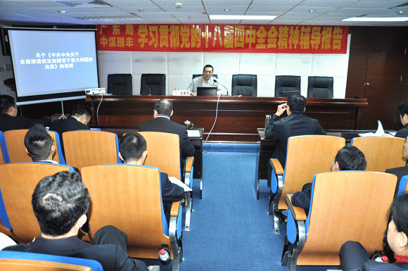 所屬單位黨政負責人和機關全體職工共60多人參加了學習。每周三下午用半天時間,分別學習《加快法制建設,促進國家治理體系和治理能力現(xiàn)代化》、《貫徹落實習近平總書記重要講話精神全面加強安全生產(chǎn)》、《哲學思維方式與領導工作方法》等專題,在領導干部的帶動下,全局興起了學習貫徹四中全會精神的新高潮。近期,廣東局和瑞豐公司黨委中心組聯(lián)合召開集中學習擴大會議。